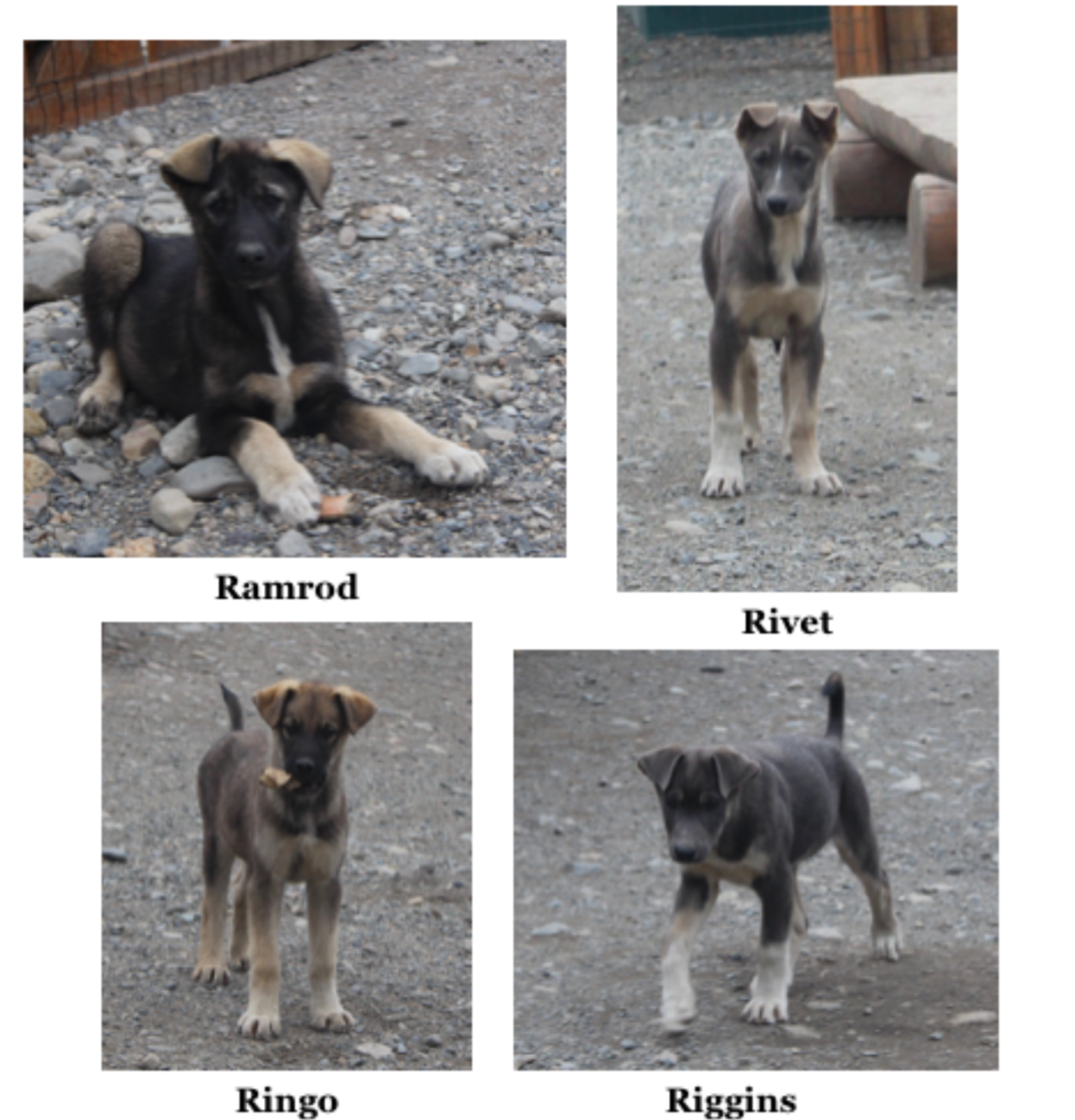 The R-Litter: Riggins, Rivet, Ramrod, Riptide, and Ringo are on their tails. It will be fun watching them grow into their personalities and their big feet.