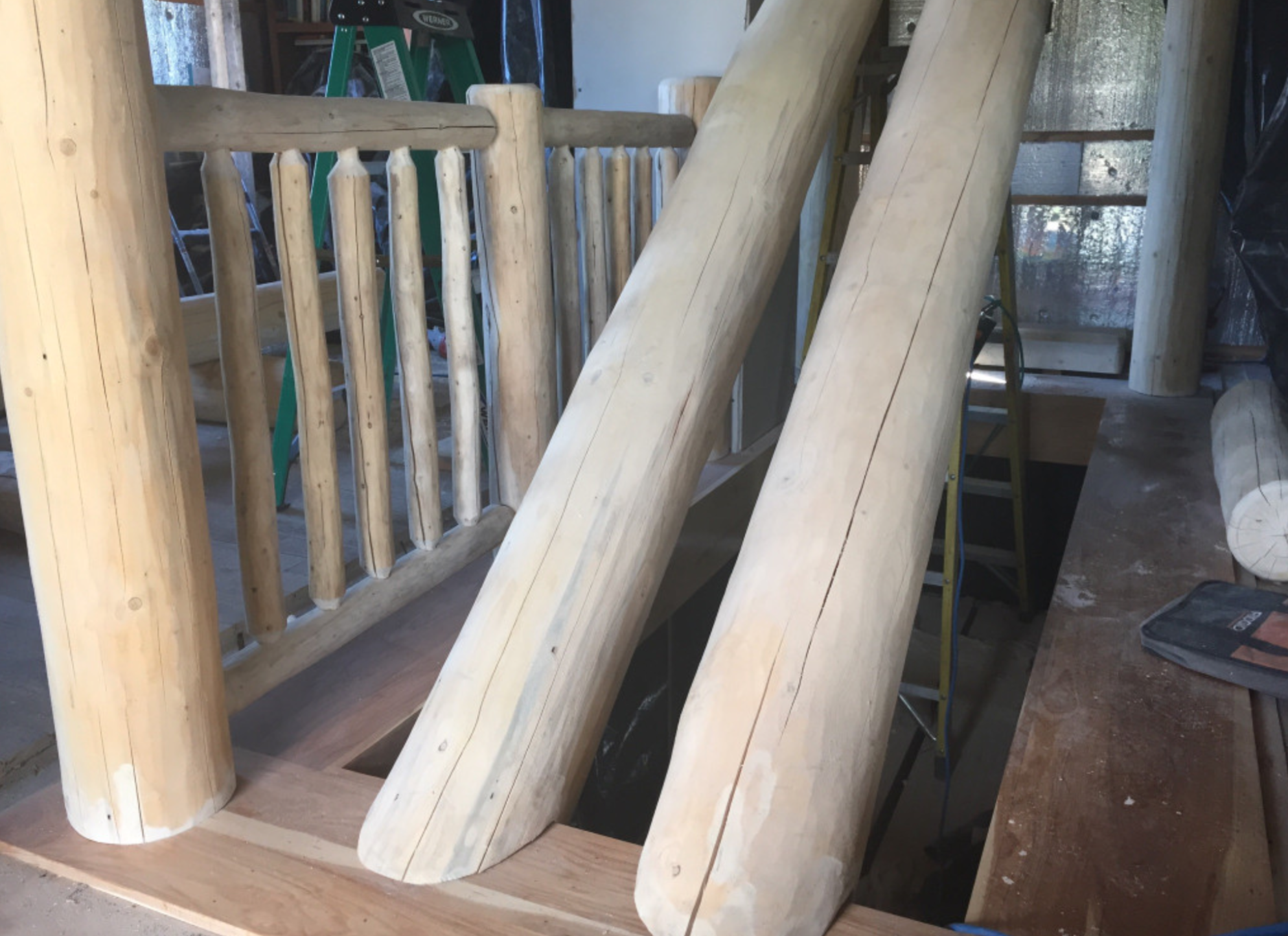Mike has been working on adding a staircase to our house. When we moved the house, we knocked out the wood furnace and chimney, and have been waiting ever since for the addition of stairs. Mike collected fire killed trees and is peeling, sanding, and scribing the logs. He has designed a two level log staircase as the centerpiece of the house. Everyday is like Christmas as I see the beautiful additions he is giving me in our home. I will be sure to continue to share the pictures of the building progress with you with you.